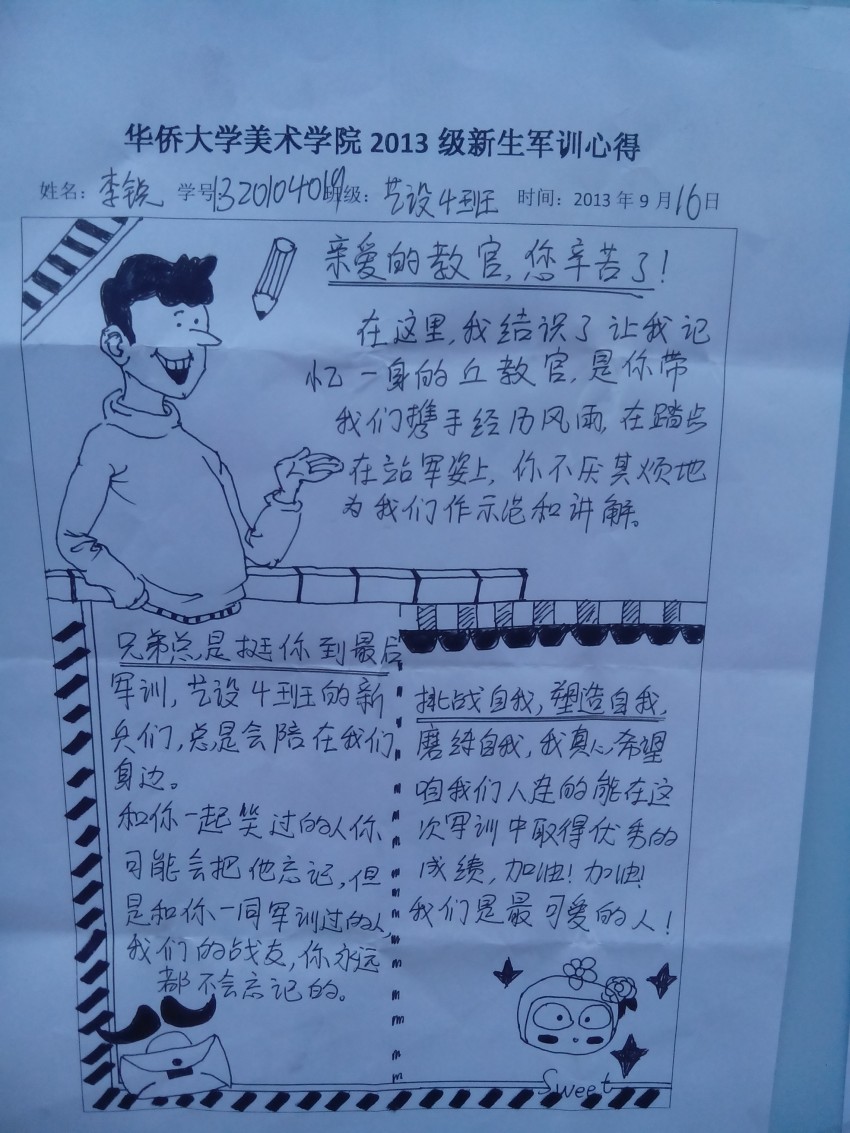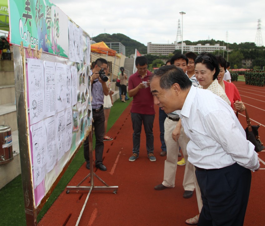 9月17号上午,校长贾益民、党委副书记朱琦环巡视泉州校区军训训练情况,在走到美术学院大本营时驻足了良久,原来是美术学院2013级新生的军训心得吸引了他们的目光。